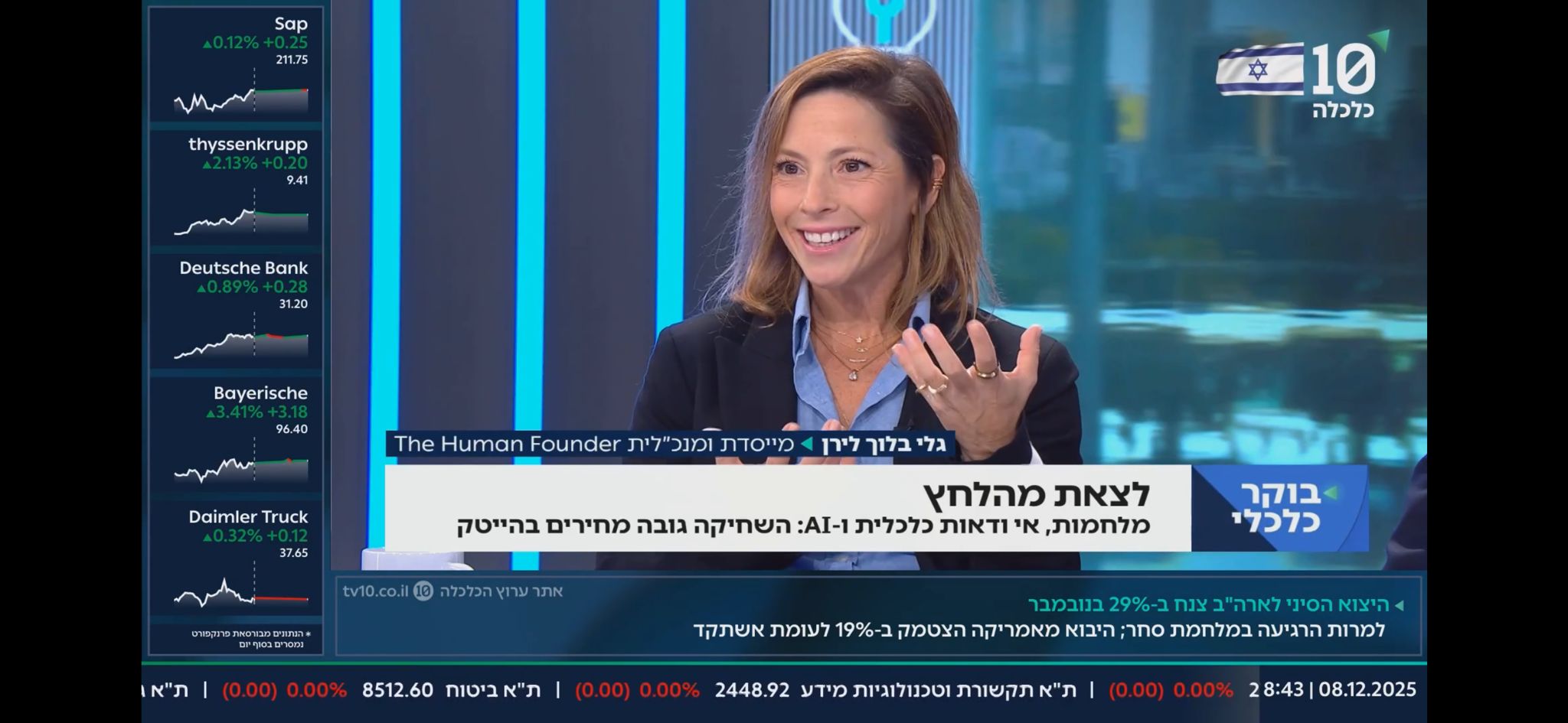 Gali Bloch Liran appeared as a guest on Boker Calcali, hosted by Maayan Priluk on Channel 10 - Israel's Economic Channel, alongside Batsheva Moshe, Arik Kleinstein, and Dror Glass. During the panel, Gali spoke about the mental side of entrepreneurship, focusing on founders’ resilience, emotional awareness, ego management, coachability, and the critical role of the human dimension in building successful companies - especially in an era of uncertainty, pressure, and AI.